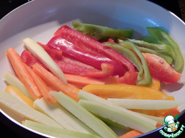 Овощи обжариваем в оливковом масле на раскаленной сковороде 3-4 минуты.