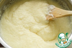 2. Тонкой струйкой влить горячее молоко и варить на медленном огне густую манную кашу. Снять с огня. остудить.