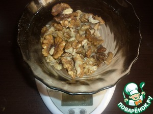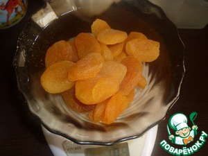 Курагу залить теплой водой и оставить на 30 минут, слить воду, обсушить и нарезать мелкими кубиками.