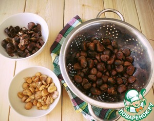 Готовые каштаны откидываем на дуршлаг и чистим от скорлупы.
