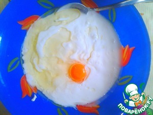 Далее яйцо, 2 ст. л. подсолнечного масла и всё залить кефиром.