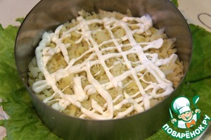 Каждый слой слегка присолить и нанести сеточку из майонеза.