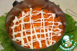 Сверху на мелкой терке равномерно натереть яичные желтки. Нанести сеточку из майонеза.