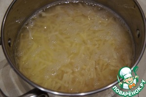 Когда крахмал осядет, слить сок, а крахмал добавить к картофелю. Посолить, поперчить.