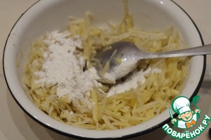 Затем воду слить. Картофель обсушить на полотенце. Добавить соль, перец и муку (примерно 1 ч. л. на 2 картофелины, только чтобы мука слегка связала картофель).