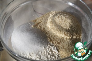 В широкой миске смешать муку, сахар, соль и миндальную крошку.