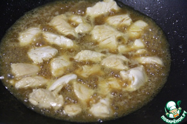 Сначала готовим соус. Для этого смешать сок апельсина, соевый соус, сок лимона, порошок чеснока и имбирного корня, соль и перец, мед.