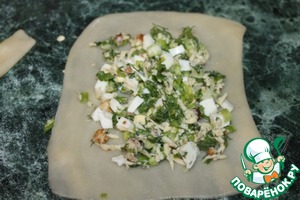 Щедро распределяем по тесту начинку, не доходя до краёв 1,5-2 см. -