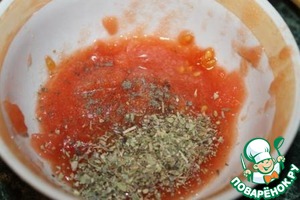 Натираем на мелкой тёрке один помидор, добавляем 1 ст. л. оливкового масла, молотый перец, соль и орегано, перемешиваем. -