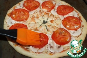 Смазываем тесто соусом, не доходя до краёв и не сильно жирно у краёв лепестков.