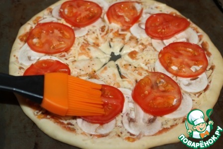 Взбалтываем желток и смазываем им лепестки и по кругу края пиццы.