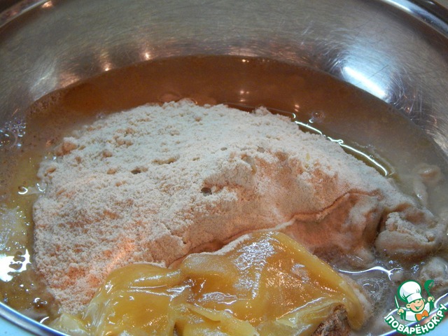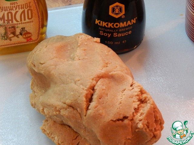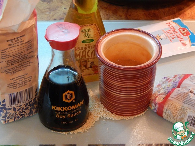 В миске соединяем толокно, мед, разрыхлитель, кунжутное масло, соевый соус 1ст. л.), воду. Замешиваем тесто.