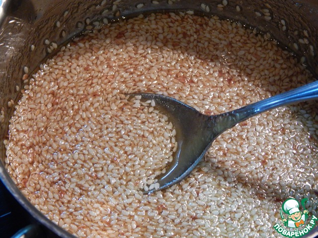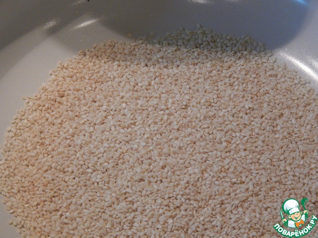 На сухой сковороде поджариваем кунжут до золотистого цвета.