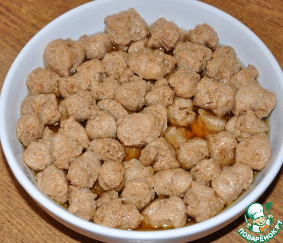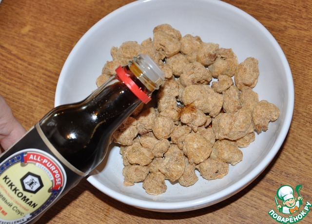 • К соевым кусочкам добавить 2-3 ст. л. соевого соуса и немного воды (примерно полстакана или чуть больше).