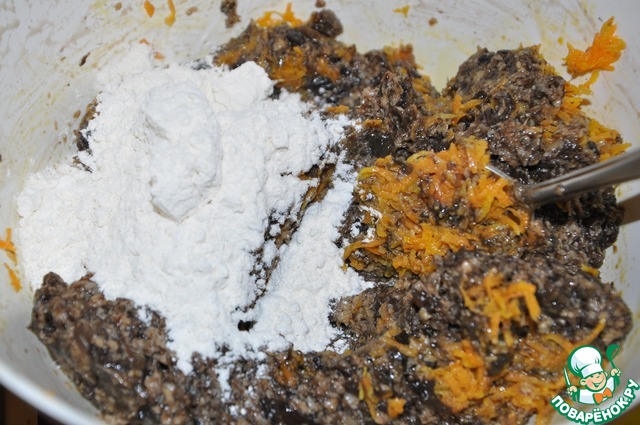 • Добавить морковку и муку (морковку я предварительно потерла и немного обжарила), добавить соль и специи по вкусу, все перемешать.