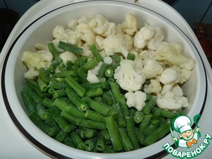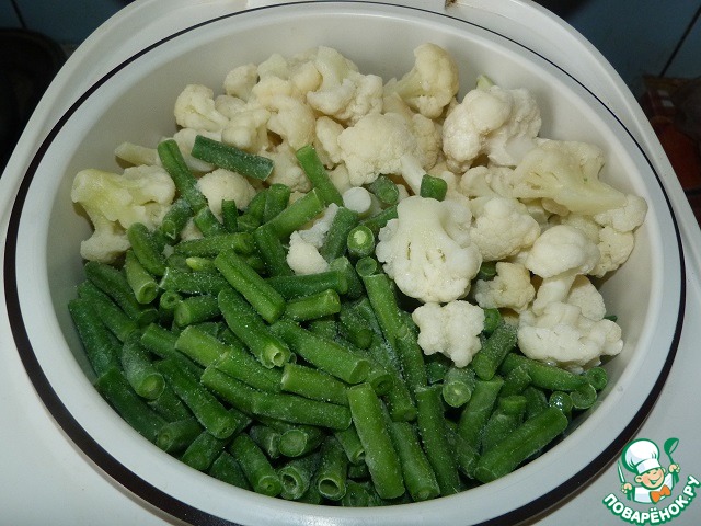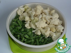 Для овощей, которые будут готовиться в контейнере-пароварке, я взяла замороженные цветную капусту и стручковую фасоль. Но тут, как и с рисом, возможны варианты. Можно использовать любые любимые овощи.