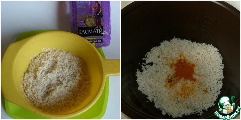 Промываем рис. Выкладываем в чашу мультиварки. Солим, добавляем куркуму.