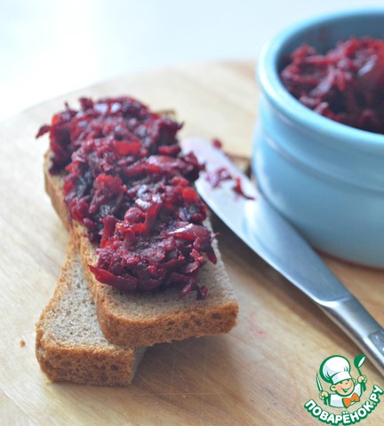Я делала её не для того, чтобы намазывать на хлеб, а наоборот в качестве салата скорей, поэтому свеклу тёрла на крупной тёрке и орехи рубила крупно.