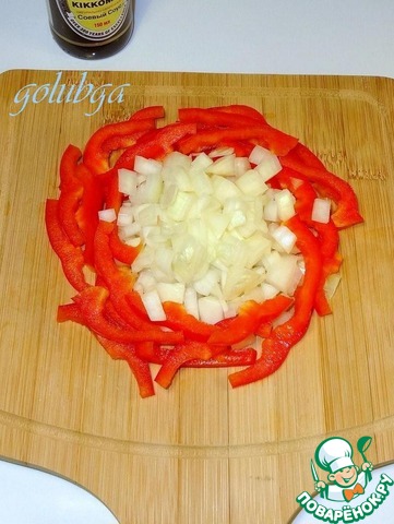 Лук нарезать маленькими кубиками, болгарский перец крупной соломкой.