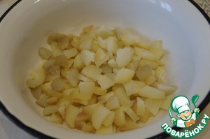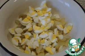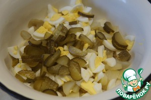 Картофель и яйца отварить и очистить. Нарезать тонкими ломтиками картофель, яйца и маринованные огурцы.