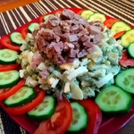 Но мне если честно, больше нравится "стандартный" салат из советского детства печень трески+отварное яйцо+плавленый сырок.