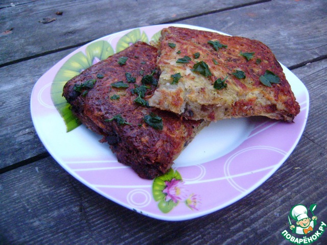 Форму ставим в горячую духовку до зарумянивания нашего... пирога, запеканки, не знаю, как определить. Большого и вкусного драника!!!