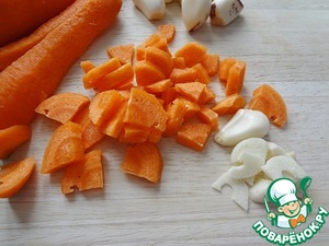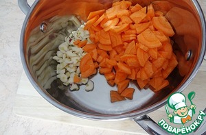 Разогреть в кастрюле пару столовых ложек растительного масла. Положить морковь и чеснок, обжаривать минут 5.
