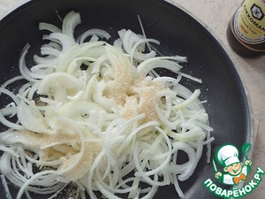 Тем временем, разогреть в большой сковороде оставшееся масло. Положить лук, нарезанный полукольцами, посыпать коричневым сахаром и готовить на среднем огне минут 20, пока лук не зажарится.