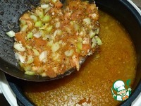 На плите разогреваем сковородку, добавляем немного (примерно 1 ст. ложку) растительного масла и выкладываем сельдерей, помидор, чеснок, добавляем специи и соль. Помешивая, быстро обжариваем, примерно минут 5-7. |