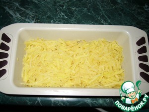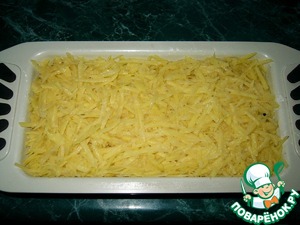 Включаем духовку на 180 градусов. Форму для выпечки смазываем растительным маслом и выкладываем половину картофеля