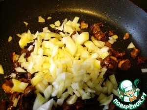 Предварительно замоченные и промытые грибы обжариваем 5 минут, режем мелко лук, добавляем и жарим до готовности лука