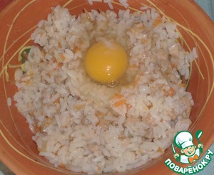 Смешиваем рис с мясом и добавляем яйцо. Всё хорошо перемешиваем.