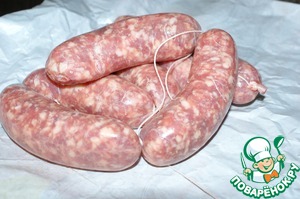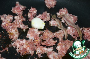 На сковороду наливаем масло, добавляем очищенный чеснок, перчик, анчоусы, колбаску (очистить от оболочки, разделить на мелкие кусочки). Как только кусочки колбаски побелеют, добавляем вино, перемешиваем и даем ему испариться (2 мин).
