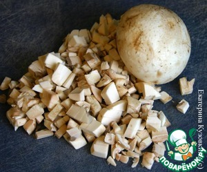 Шампиньоны почистить и мелко нарезать. Пожарить. Из грибов должна по максимуму уйти влага, кроме того, они должны подрумяниться.
