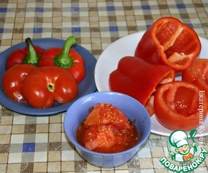 Подготовьте перцы и томаты для фарширования. Нужно срезать с овощей верхушки, у перцев удалить семена, у томатов - мякоть.