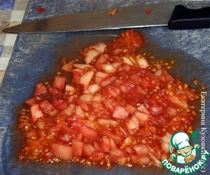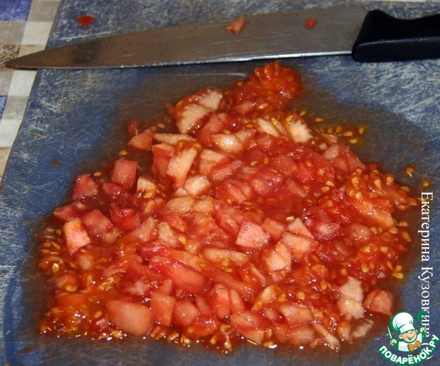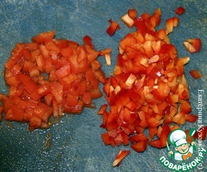 "Верхушки" томатов и перцев нарежьте мелким кубиком. Советую снять с кусочков томата шкурку, так начинка получится нежнее.