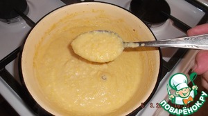 В молоко выкладываем кукурузу, сливочное масло и ст. ложку муки с горкой. Размешиваем и ставим на огонь. Мешая, доводим до кипения, масса должна загустеть. Снимаем с огня и остужаем.