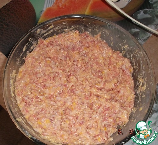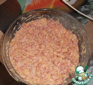 Смешиваем кукурузную кашу с фаршем, солим, перчим, добавляем манку и остальную муку.