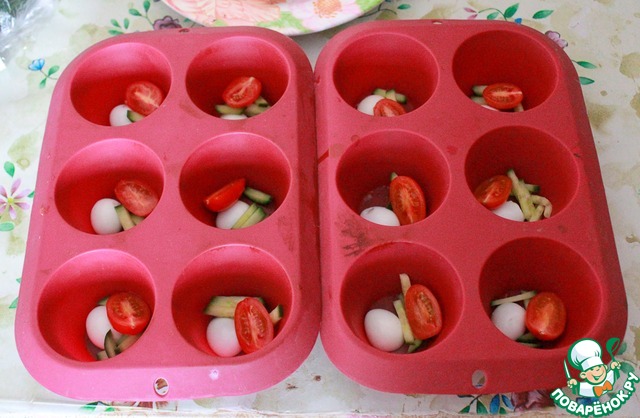 На низ формочек кладём разрезанные перепелиные яички, помидорки и нарезанный огурчик.