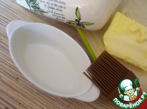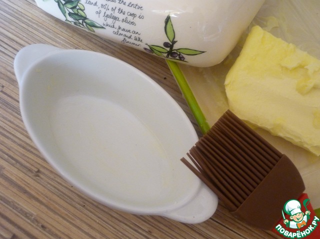 Для начала необходимо найти подходящую формочку для запекания. Это может быть несколько маленьких (по количеству едоков) или одна большая. Я делала в маленькой, привожу раскладку на 1 порцию.