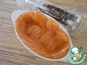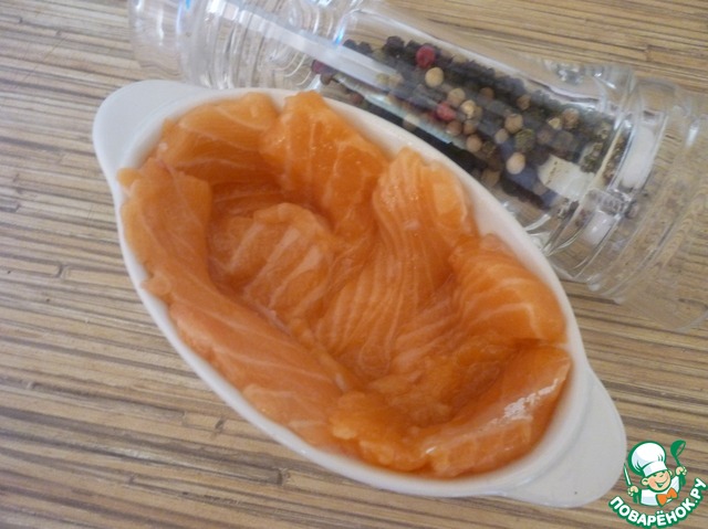 Лосось нарезаем пластами шириной около 1 см, выкладываем формочку рыбой. Перчим и солим по вкусу (я не солю, но это мне так нравится, да и ребенку количество соли необходимо регулировать)