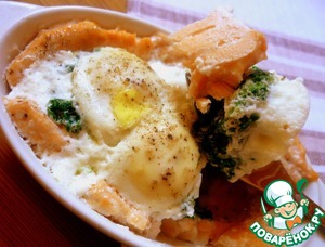 Процесс подготовки рыбы, по желанию, ТОЛЩИНА пласта 1-1,5 см. Рыбу ставим в разогретую духовку на 10-12 мин. без овощей. Затем вынимаем рыбу, делам на ней гнездышко из овощей, и аккуратно выпускаем яйцо. Включаем гриль на 2-3 мин., определяемся визуально, яйца не дать подгореть. Если духовка без гриля, то рыбу просто переварачиваем, перед добавлением яиц и овощей.