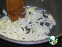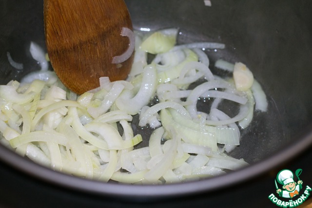 Налить оливковое масло в чашу мультиварки, включить режим "ЖАРКА", выставить время – 20 минут, дать нагреться. В разогретое масло выложить репчатый лук, нарезанный полукольцами. Жарить до золотистого цвета и прозрачности лука (10-15 минут). |