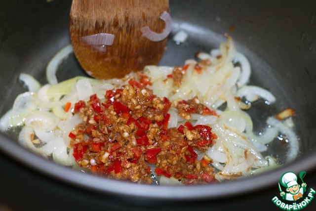 Добавить массу к луку и жарить, помешивая, еще 2 минуты.