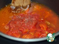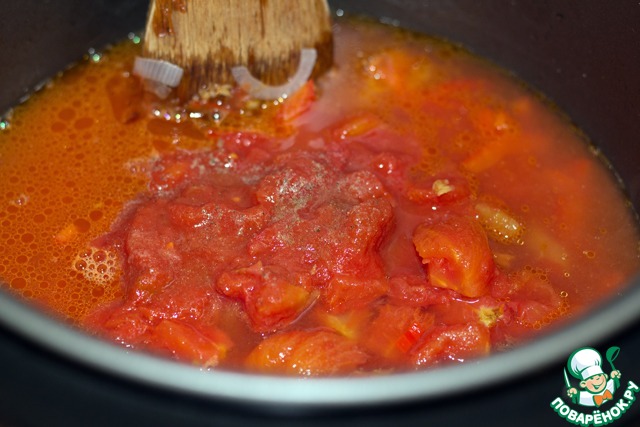 Влить бульон или воду, добавить томаты в собственном соку, сахар, смесь перцев. Включить режим "ТУШЕНИЕ", выставить время - 30 минут. |