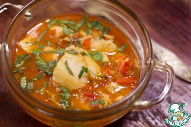 Подается блюдо с традиционными лепешками. Очень вкусно отламывать мякиш и макать в соус, заедая кусочками рыбы. При подаче посыпать мелконарезанной зеленью.