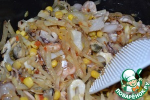 Добавляем кукурузу, рыбу двух видов и морской коктейль. Перемешиваем.
