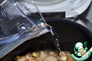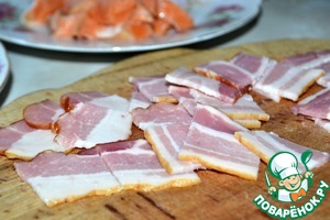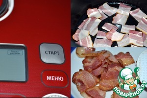 Выбираем программу "Поджаривание", выкладываем бекон и жарим его до приятного золотистого цвета (примерно по 5 мин. с каждой стороны), убираем из МВ.