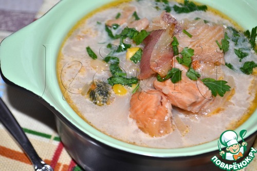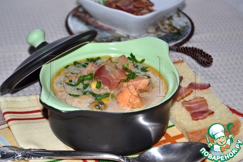 Наваристый вкусный суп из двух видов рыбы и морепродуктов с хрустящими чипсами из бекона. Приготовлен суп в мультиварке "Vitek" VT-4206-R. Ну, очень вкусно! Интересно? Заходите и я вас угощу.