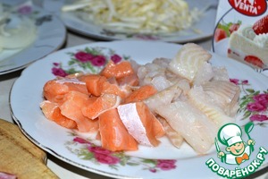 - Рыба (100 г красной + 100 г белой морской рыбы) — 200 г